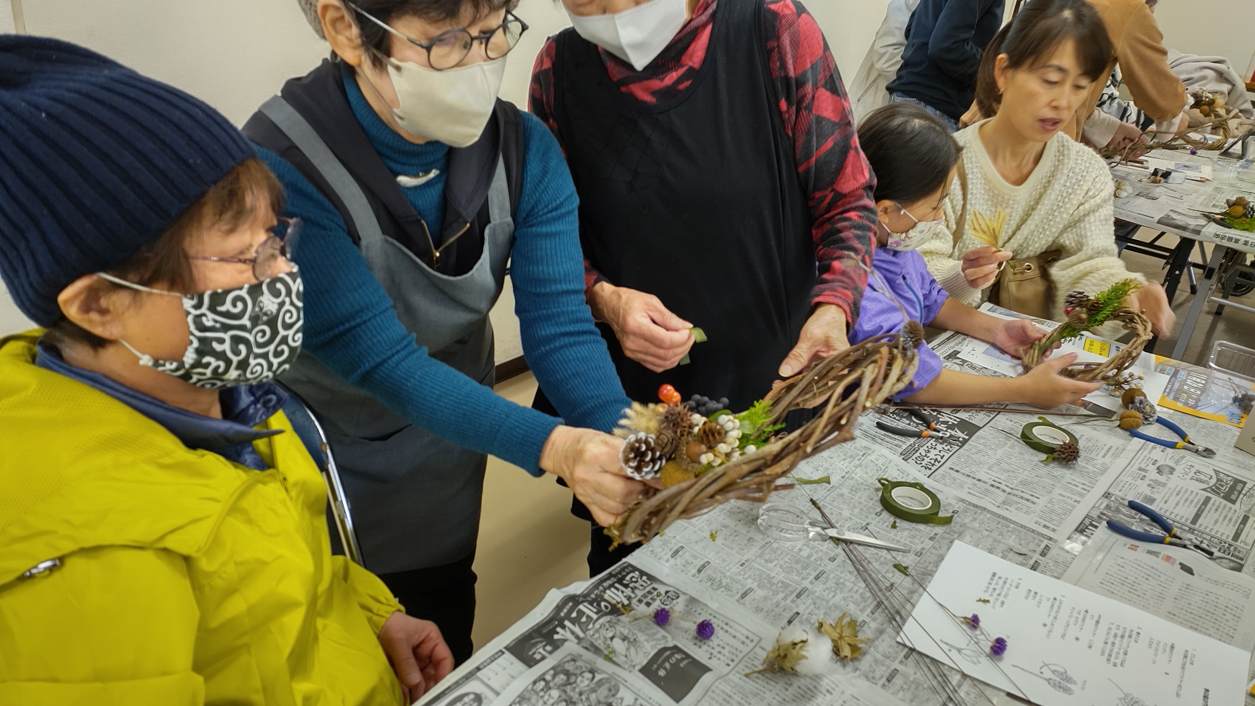 内容と目的 : ➀竹を伐る際出てくる蔓や、木の実や自然素材を使ってリースを作る